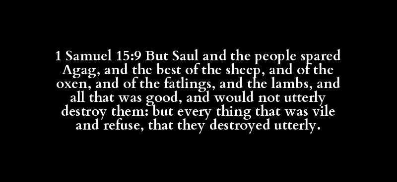 1 Samuel 15:9 But Saul and the people spared Agag, and the best of the sheep, and of the oxen, and of the fatlings, and the lambs, and all that was good, and would not utterly destroy them: but every thing that was vile and refuse, that they destroyed utterly.