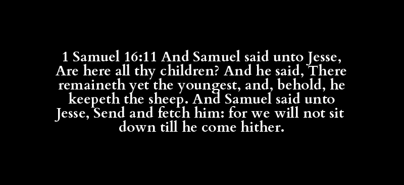 1 Samuel 16:11 And Samuel said unto Jesse, Are here all thy children? And he said, There remaineth yet the youngest, and, behold, he keepeth the sheep. And Samuel said unto Jesse, Send and fetch him: for we will not sit down till he come hither.