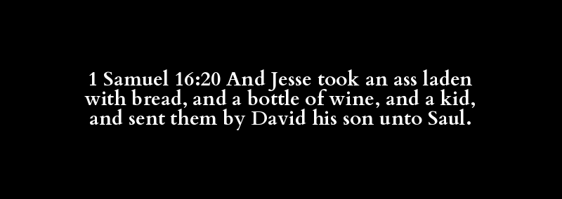 1 Samuel 16:20 And Jesse took an ass laden with bread, and a bottle of wine, and a kid, and sent them by David his son unto Saul.