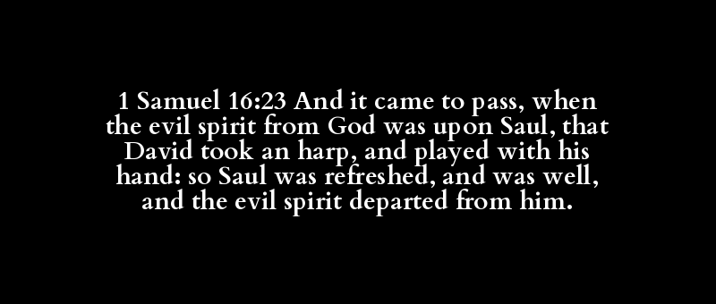 1 Samuel 16:23 And it came to pass, when the evil spirit from God was upon Saul, that David took an harp, and played with his hand: so Saul was refreshed, and was well, and the evil spirit departed from him.