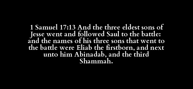 1 Samuel 17:13 And the three eldest sons of Jesse went and followed Saul to the battle: and the names of his three sons that went to the battle were Eliab the firstborn, and next unto him Abinadab, and the third Shammah.
