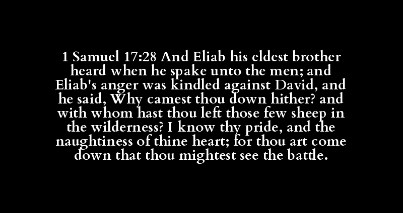 1 Samuel 17:28 And Eliab his eldest brother heard when he spake unto the men; and Eliab's anger was kindled against David, and he said, Why camest thou down hither? and with whom hast thou left those few sheep in the wilderness? I know thy pride, and the naughtiness of thine heart; for thou art come down that thou mightest see the battle.