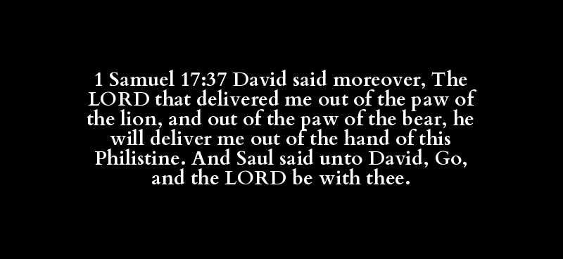 1 Samuel 17:37 David said moreover, The LORD that delivered me out of the paw of the lion, and out of the paw of the bear, he will deliver me out of the hand of this Philistine. And Saul said unto David, Go, and the LORD be with thee.