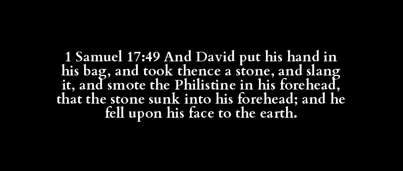 1 Samuel 17:49 And David put his hand in his bag, and took thence a stone, and slang it, and smote the Philistine in his forehead, that the stone sunk into his forehead; and he fell upon his face to the earth.