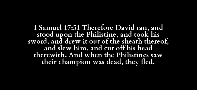 1 Samuel 17:51 Therefore David ran, and stood upon the Philistine, and took his sword, and drew it out of the sheath thereof, and slew him, and cut off his head therewith. And when the Philistines saw their champion was dead, they fled.
