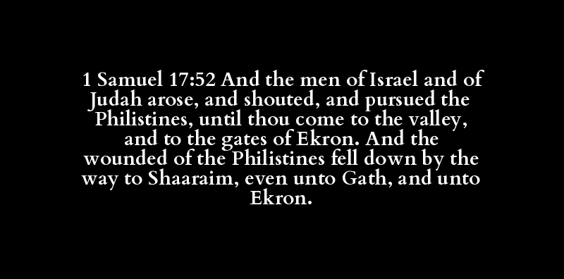 1 Samuel 17:52 And the men of Israel and of Judah arose, and shouted, and pursued the Philistines, until thou come to the valley, and to the gates of Ekron. And the wounded of the Philistines fell down by the way to Shaaraim, even unto Gath, and unto Ekron.