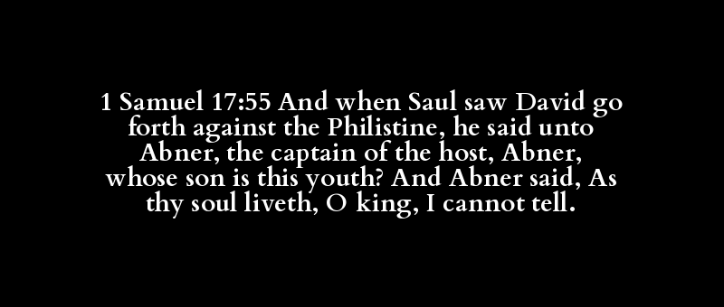 1 Samuel 17:55 And when Saul saw David go forth against the Philistine, he said unto Abner, the captain of the host, Abner, whose son is this youth? And Abner said, As thy soul liveth, O king, I cannot tell.