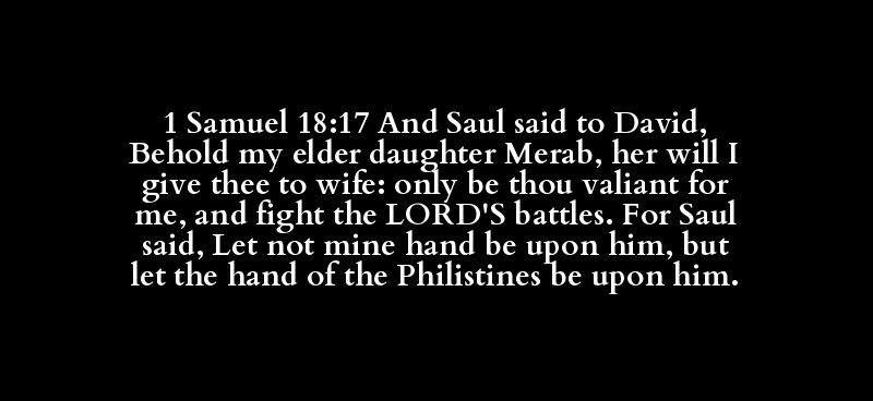 1 Samuel 18:17 And Saul said to David, Behold my elder daughter Merab, her will I give thee to wife: only be thou valiant for me, and fight the LORD'S battles. For Saul said, Let not mine hand be upon him, but let the hand of the Philistines be upon him.