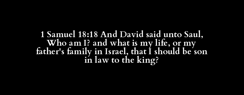 1 Samuel 18:18 And David said unto Saul, Who am I? and what is my life, or my father's family in Israel, that I should be son in law to the king?