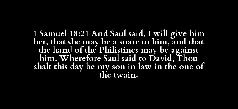 1 Samuel 18:21 And Saul said, I will give him her, that she may be a snare to him, and that the hand of the Philistines may be against him. Wherefore Saul said to David, Thou shalt this day be my son in law in the one of the twain.