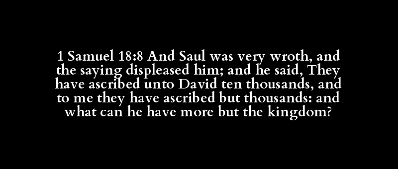 1 Samuel 18:8 And Saul was very wroth, and the saying displeased him; and he said, They have ascribed unto David ten thousands, and to me they have ascribed but thousands: and what can he have more but the kingdom?