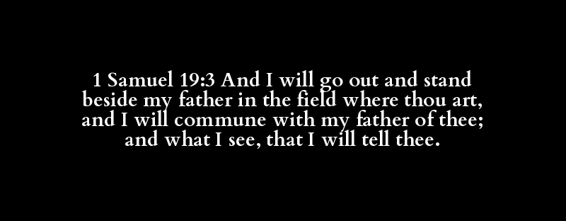 1 Samuel 19:3 And I will go out and stand beside my father in the field where thou art, and I will commune with my father of thee; and what I see, that I will tell thee.