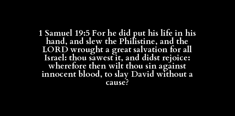 1 Samuel 19:5 For he did put his life in his hand, and slew the Philistine, and the LORD wrought a great salvation for all Israel: thou sawest it, and didst rejoice: wherefore then wilt thou sin against innocent blood, to slay David without a cause?