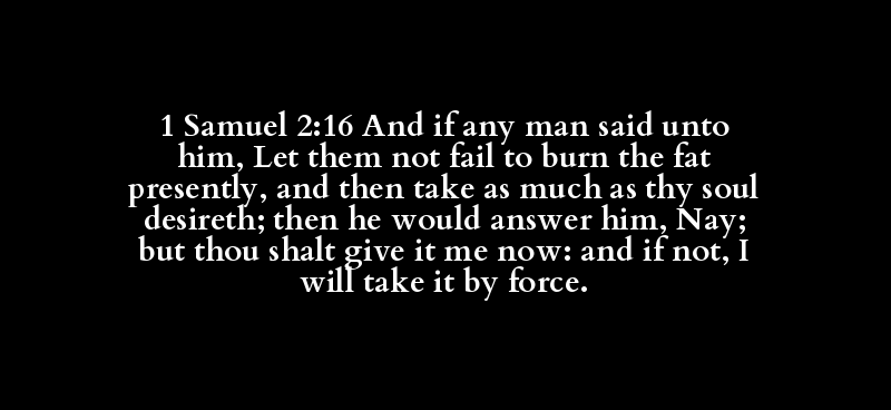 1 Samuel 2:16 And if any man said unto him, Let them not fail to burn the fat presently, and then take as much as thy soul desireth; then he would answer him, Nay; but thou shalt give it me now: and if not, I will take it by force.