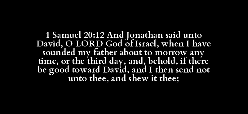1 Samuel 20:12 And Jonathan said unto David, O LORD God of Israel, when I have sounded my father about to morrow any time, or the third day, and, behold, if there be good toward David, and I then send not unto thee, and shew it thee;