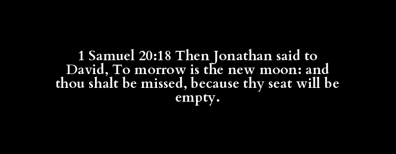 1 Samuel 20:18 Then Jonathan said to David, To morrow is the new moon: and thou shalt be missed, because thy seat will be empty.