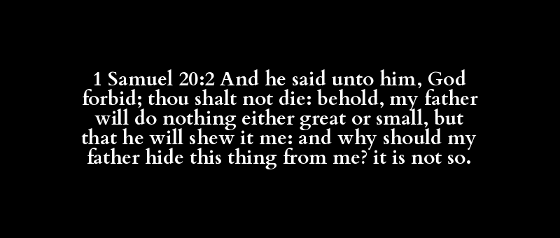 1 Samuel 20:2 And he said unto him, God forbid; thou shalt not die: behold, my father will do nothing either great or small, but that he will shew it me: and why should my father hide this thing from me? it is not so.