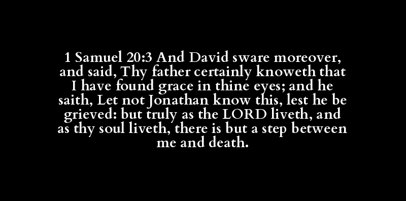1 Samuel 20:3 And David sware moreover, and said, Thy father certainly knoweth that I have found grace in thine eyes; and he saith, Let not Jonathan know this, lest he be grieved: but truly as the LORD liveth, and as thy soul liveth, there is but a step between me and death.