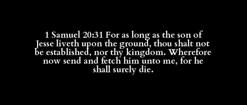 1 Samuel 20:31 For as long as the son of Jesse liveth upon the ground, thou shalt not be established, nor thy kingdom. Wherefore now send and fetch him unto me, for he shall surely die.