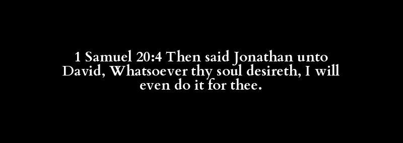 1 Samuel 20:4 Then said Jonathan unto David, Whatsoever thy soul desireth, I will even do it for thee.