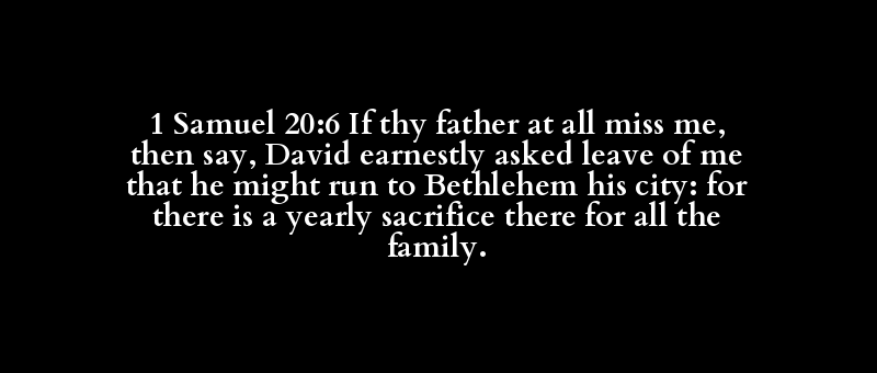 1 Samuel 20:6 If thy father at all miss me, then say, David earnestly asked leave of me that he might run to Bethlehem his city: for there is a yearly sacrifice there for all the family.