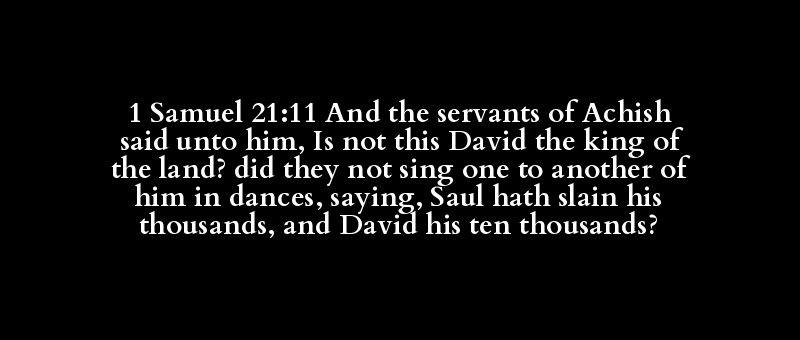 1 Samuel 21:11 And the servants of Achish said unto him, Is not this David the king of the land? did they not sing one to another of him in dances, saying, Saul hath slain his thousands, and David his ten thousands?