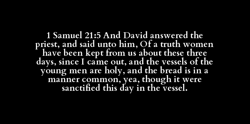 1 Samuel 21:5 And David answered the priest, and said unto him, Of a truth women have been kept from us about these three days, since I came out, and the vessels of the young men are holy, and the bread is in a manner common, yea, though it were sanctified this day in the vessel.