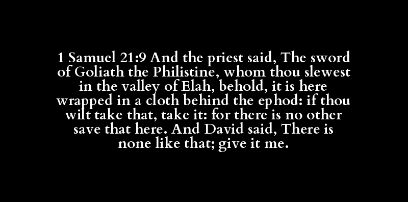 1 Samuel 21:9 And the priest said, The sword of Goliath the Philistine, whom thou slewest in the valley of Elah, behold, it is here wrapped in a cloth behind the ephod: if thou wilt take that, take it: for there is no other save that here. And David said, There is none like that; give it me.