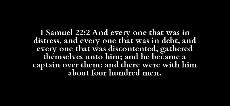 1 Samuel 22:2 And every one that was in distress, and every one that was in debt, and every one that was discontented, gathered themselves unto him; and he became a captain over them: and there were with him about four hundred men.
