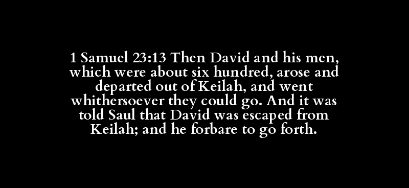 1 Samuel 23:13 Then David and his men, which were about six hundred, arose and departed out of Keilah, and went whithersoever they could go. And it was told Saul that David was escaped from Keilah; and he forbare to go forth.