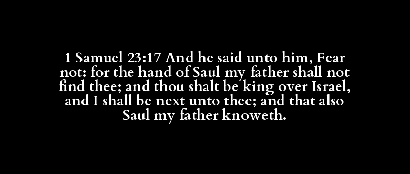 1 Samuel 23:17 And he said unto him, Fear not: for the hand of Saul my father shall not find thee; and thou shalt be king over Israel, and I shall be next unto thee; and that also Saul my father knoweth.