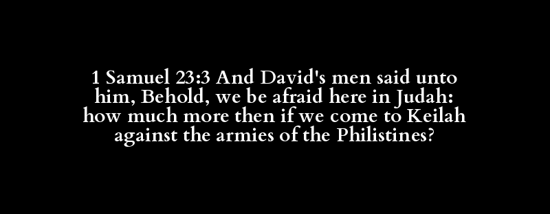 1 Samuel 23:3 And David's men said unto him, Behold, we be afraid here in Judah: how much more then if we come to Keilah against the armies of the Philistines?