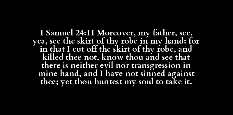 1 Samuel 24:11 Moreover, my father, see, yea, see the skirt of thy robe in my hand: for in that I cut off the skirt of thy robe, and killed thee not, know thou and see that there is neither evil nor transgression in mine hand, and I have not sinned against thee; yet thou huntest my soul to take it.