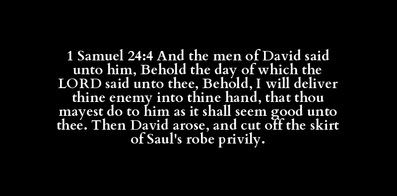 1 Samuel 24:4 And the men of David said unto him, Behold the day of which the LORD said unto thee, Behold, I will deliver thine enemy into thine hand, that thou mayest do to him as it shall seem good unto thee. Then David arose, and cut off the skirt of Saul's robe privily.