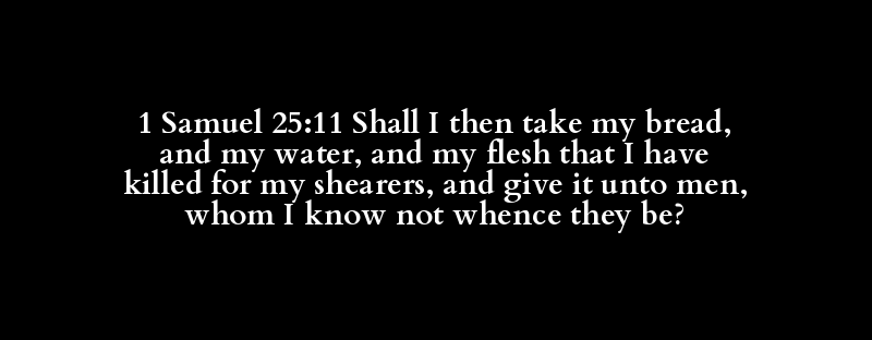 1 Samuel 25:11 Shall I then take my bread, and my water, and my flesh that I have killed for my shearers, and give it unto men, whom I know not whence they be?