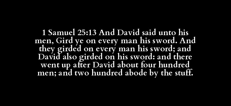1 Samuel 25:13 And David said unto his men, Gird ye on every man his sword. And they girded on every man his sword; and David also girded on his sword: and there went up after David about four hundred men; and two hundred abode by the stuff.