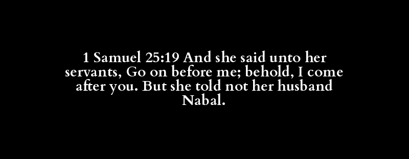 1 Samuel 25:19 And she said unto her servants, Go on before me; behold, I come after you. But she told not her husband Nabal.