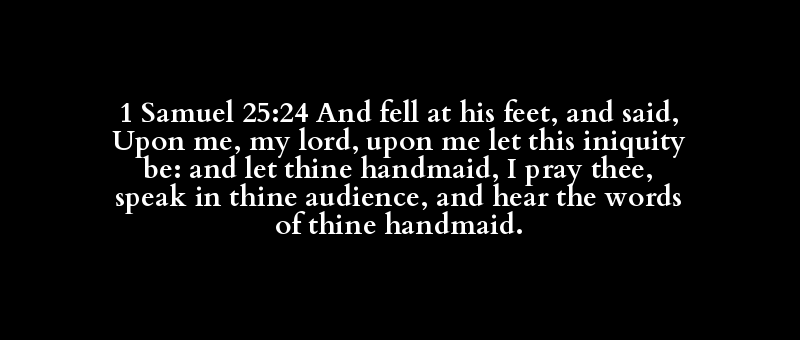 1 Samuel 25:24 And fell at his feet, and said, Upon me, my lord, upon me let this iniquity be: and let thine handmaid, I pray thee, speak in thine audience, and hear the words of thine handmaid.