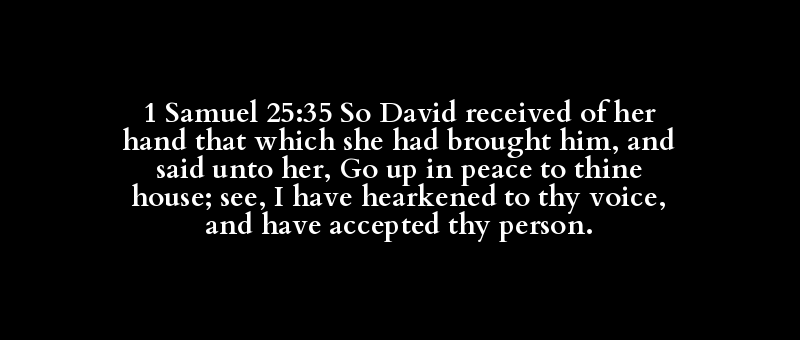 1 Samuel 25:35 So David received of her hand that which she had brought him, and said unto her, Go up in peace to thine house; see, I have hearkened to thy voice, and have accepted thy person.