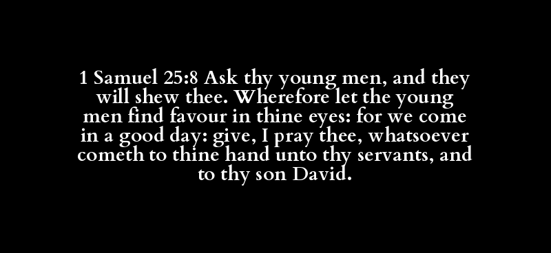 1 Samuel 25:8 Ask thy young men, and they will shew thee. Wherefore let the young men find favour in thine eyes: for we come in a good day: give, I pray thee, whatsoever cometh to thine hand unto thy servants, and to thy son David.