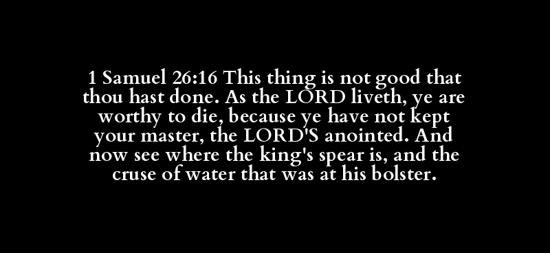 1 Samuel 26:16 This thing is not good that thou hast done. As the LORD liveth, ye are worthy to die, because ye have not kept your master, the LORD'S anointed. And now see where the king's spear is, and the cruse of water that was at his bolster.