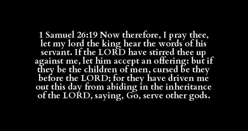 1 Samuel 26:19 Now therefore, I pray thee, let my lord the king hear the words of his servant. If the LORD have stirred thee up against me, let him accept an offering: but if they be the children of men, cursed be they before the LORD; for they have driven me out this day from abiding in the inheritance of the LORD, saying, Go, serve other gods.