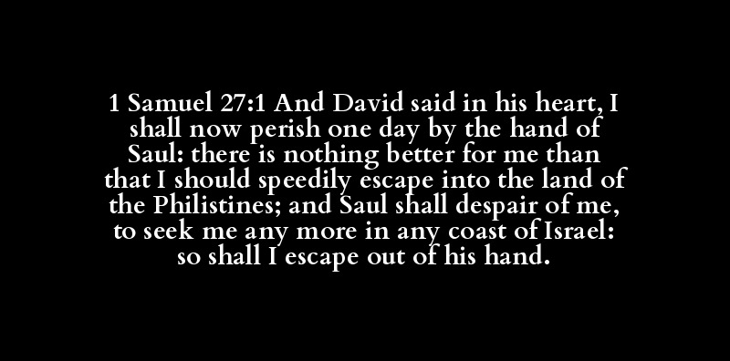 1 Samuel 27:1 And David said in his heart, I shall now perish one day by the hand of Saul: there is nothing better for me than that I should speedily escape into the land of the Philistines; and Saul shall despair of me, to seek me any more in any coast of Israel: so shall I escape out of his hand.