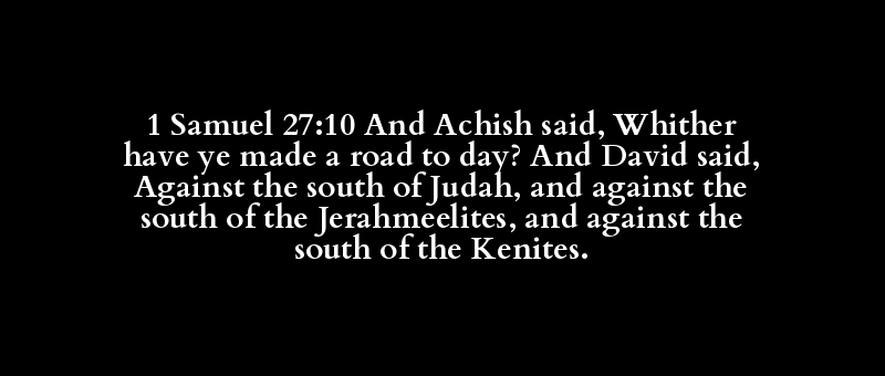 1 Samuel 27:10 And Achish said, Whither have ye made a road to day? And David said, Against the south of Judah, and against the south of the Jerahmeelites, and against the south of the Kenites.
