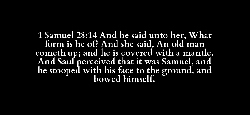 1 Samuel 28:14 And he said unto her, What form is he of? And she said, An old man cometh up; and he is covered with a mantle. And Saul perceived that it was Samuel, and he stooped with his face to the ground, and bowed himself.