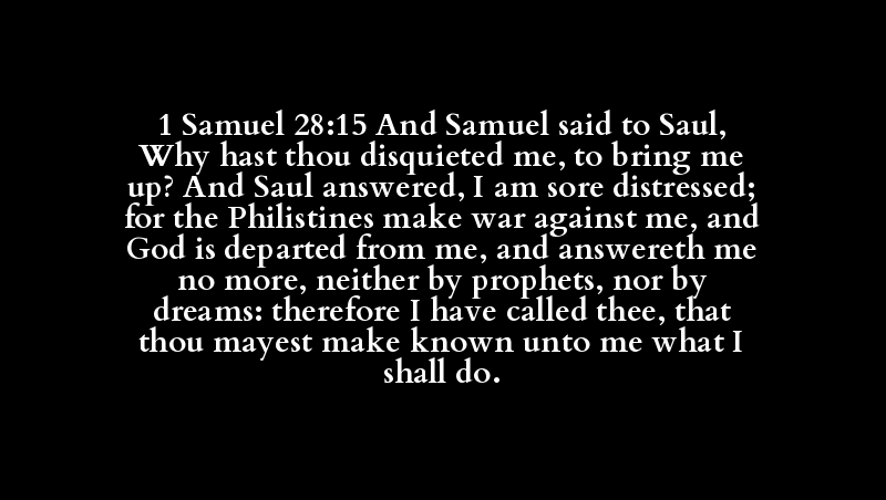 1 Samuel 28:15 And Samuel said to Saul, Why hast thou disquieted me, to bring me up? And Saul answered, I am sore distressed; for the Philistines make war against me, and God is departed from me, and answereth me no more, neither by prophets, nor by dreams: therefore I have called thee, that thou mayest make known unto me what I shall do.