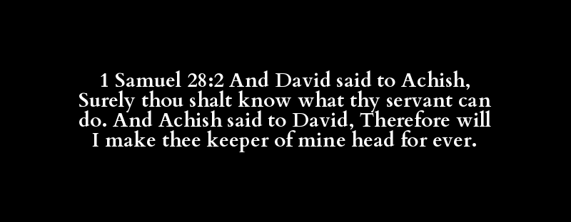 1 Samuel 28:2 And David said to Achish, Surely thou shalt know what thy servant can do. And Achish said to David, Therefore will I make thee keeper of mine head for ever.