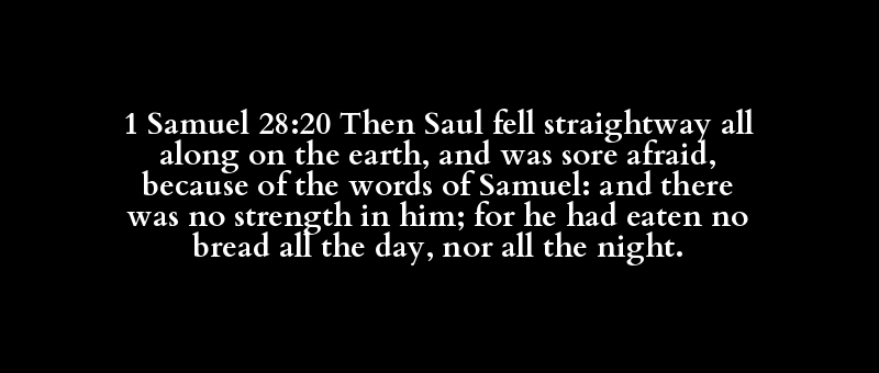 1 Samuel 28:20 Then Saul fell straightway all along on the earth, and was sore afraid, because of the words of Samuel: and there was no strength in him; for he had eaten no bread all the day, nor all the night.