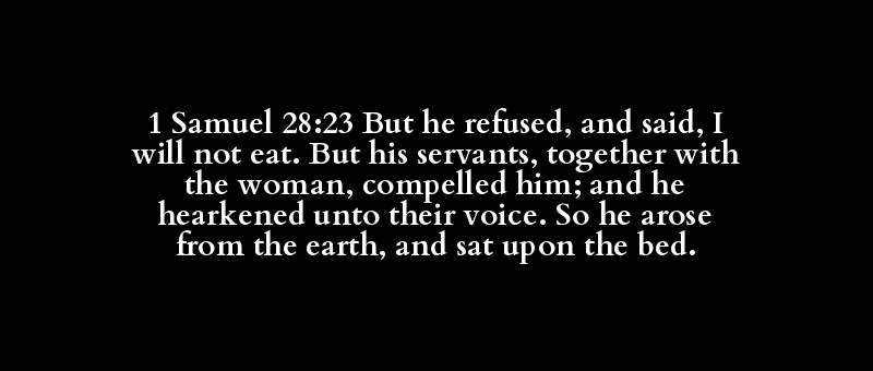 1 Samuel 28:23 But he refused, and said, I will not eat. But his servants, together with the woman, compelled him; and he hearkened unto their voice. So he arose from the earth, and sat upon the bed.