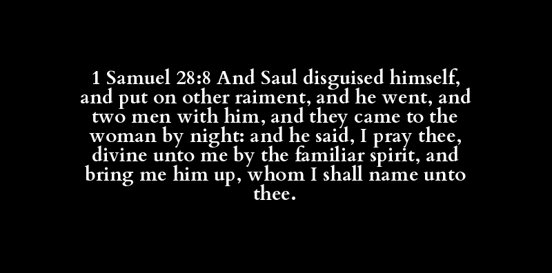 1 Samuel 28:8 And Saul disguised himself, and put on other raiment, and he went, and two men with him, and they came to the woman by night: and he said, I pray thee, divine unto me by the familiar spirit, and bring me him up, whom I shall name unto thee.